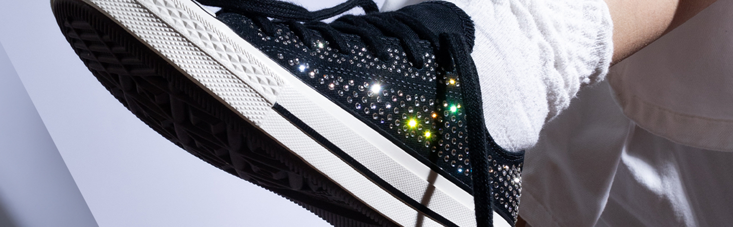 A colaboração entre Converse e Swarovski reimagina o clássico Chuck 70 através de uma lente sofisticada. A autenticidade da Converse, presente desde os anos 70, encontra o universo artesanal e luxuoso da Swarovski, resultando em um sneaker que honra sua origem e a projeta para um novo patamar de elegância.