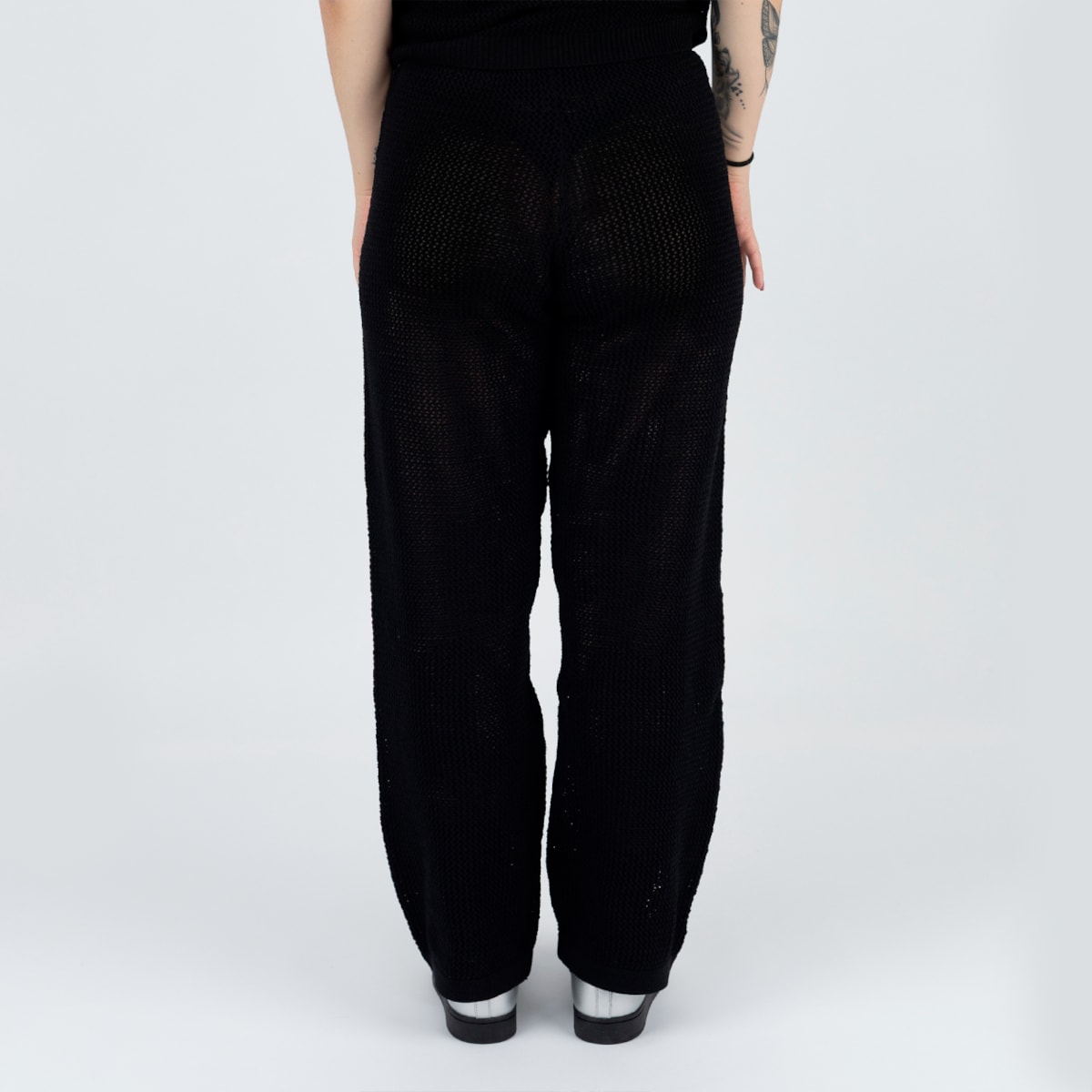 malha tricotada tipo crochê, sem bolsos, e com regulagem na cintura, o modelo proporciona estilo e versatilidade para o dia a dia.
