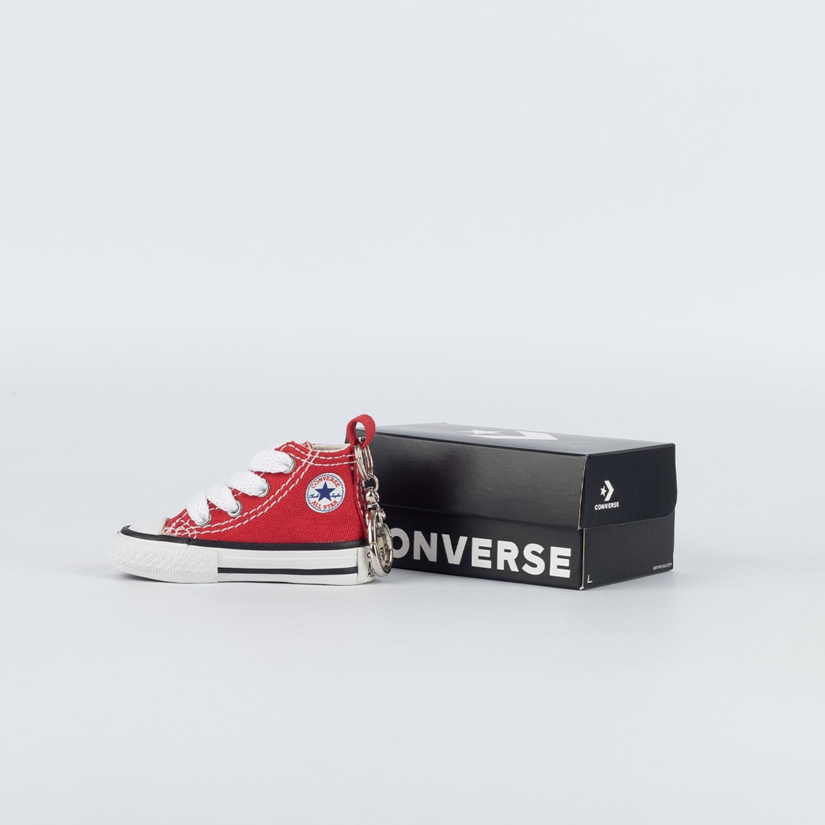 Chaveiro em miniatura do icônico All Star Chuck Taylor. Inspirado no design original do tênis, o acessório apresenta detalhes autênticos que refletem o