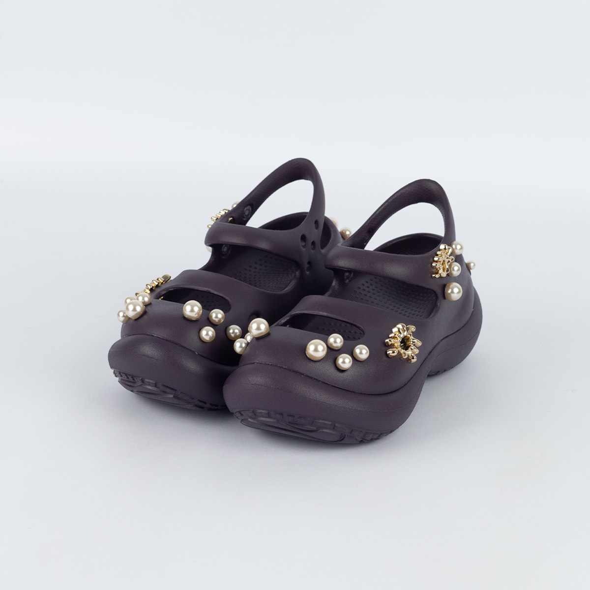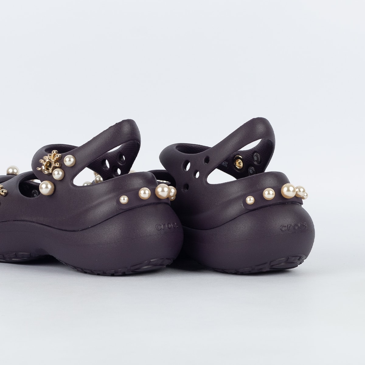 Croslite™(resina de célula fechada), o modelo garante leveza, flexibilidade, durabilidade e suporte para o dia todo, enquanto a tira giratória no calcanhar oferece ajuste seguro e versatilidade no uso. As pérolas da parte superior e da tira são removíveis, permitindo a personalização com