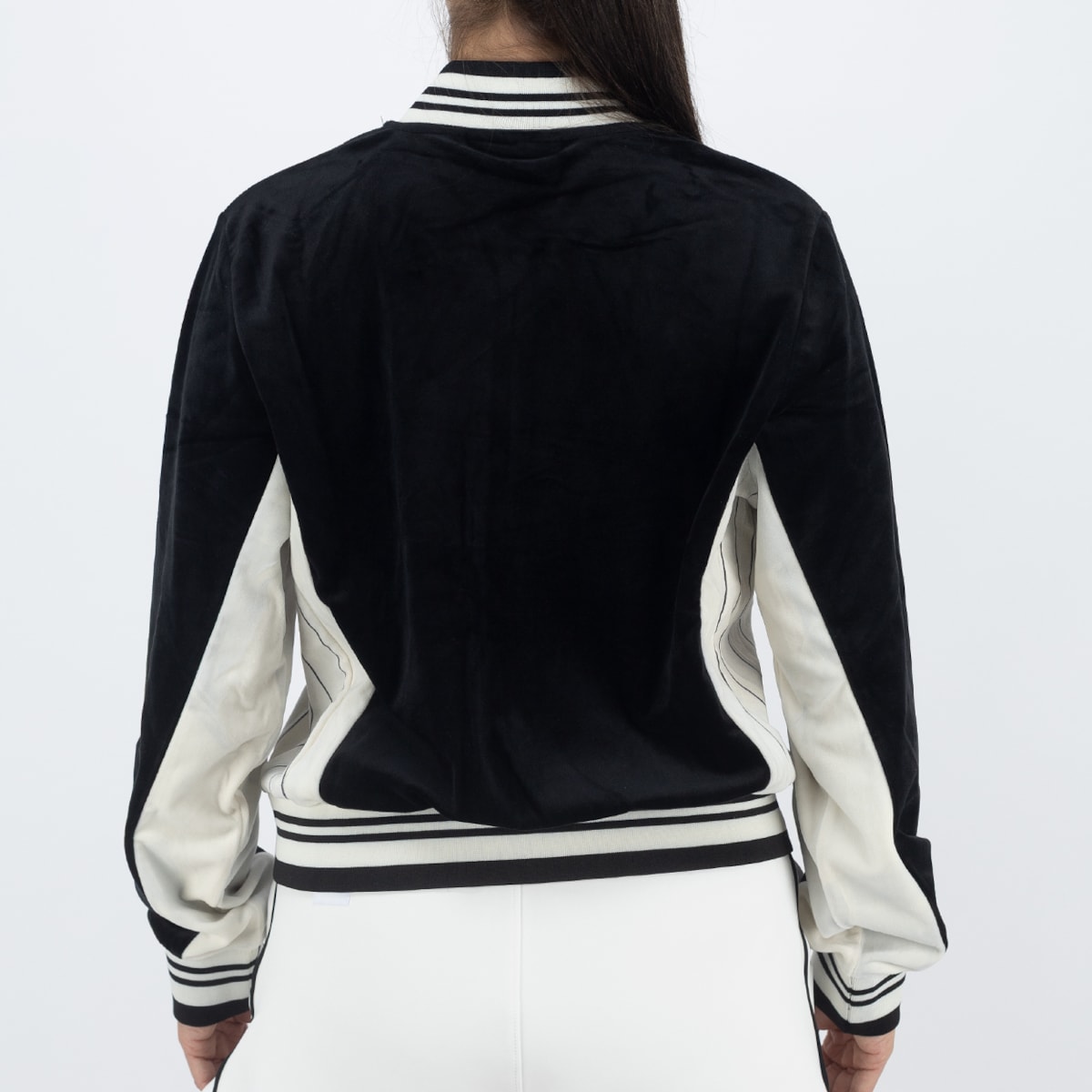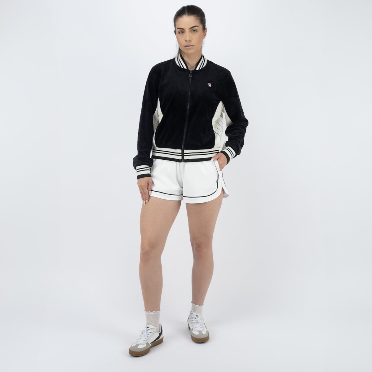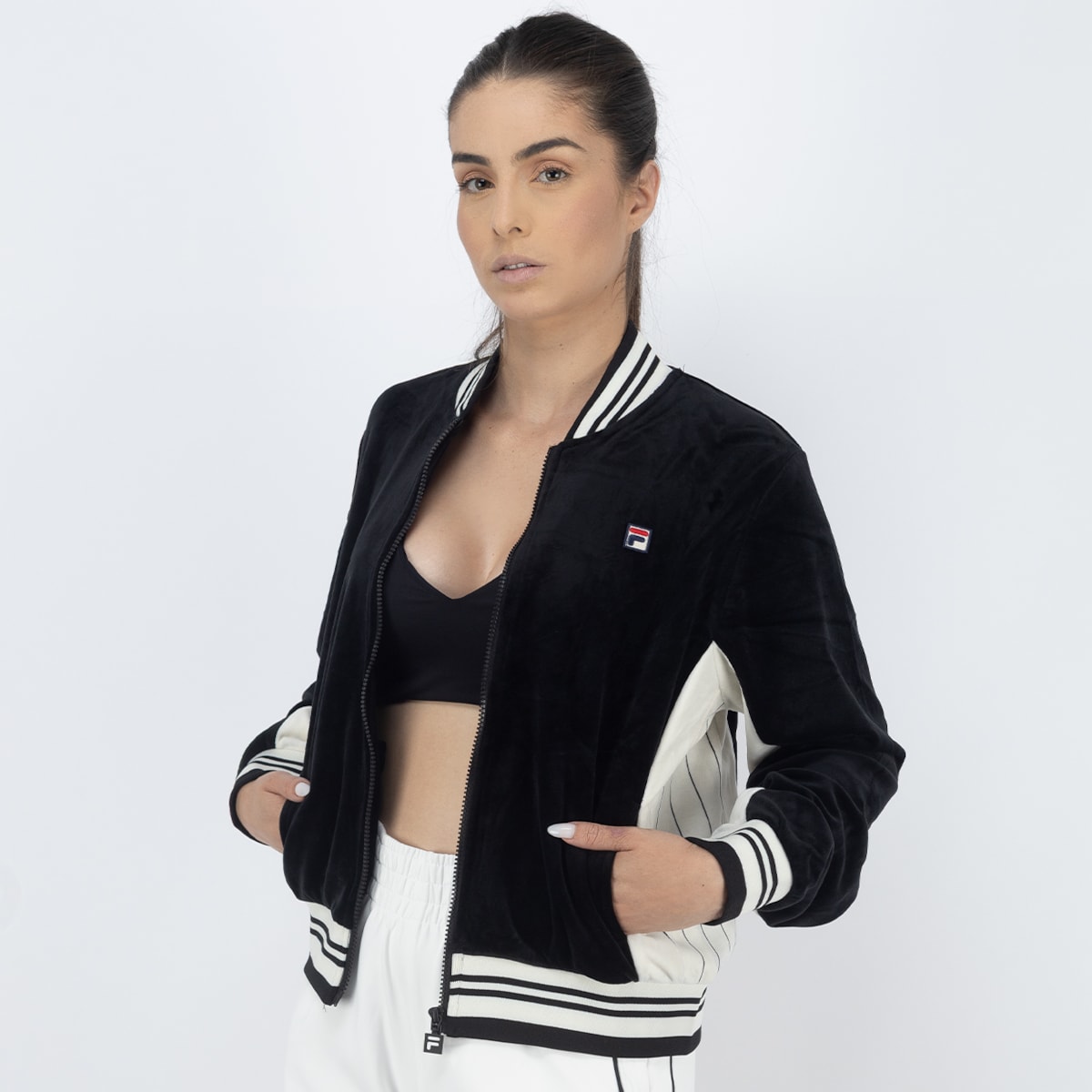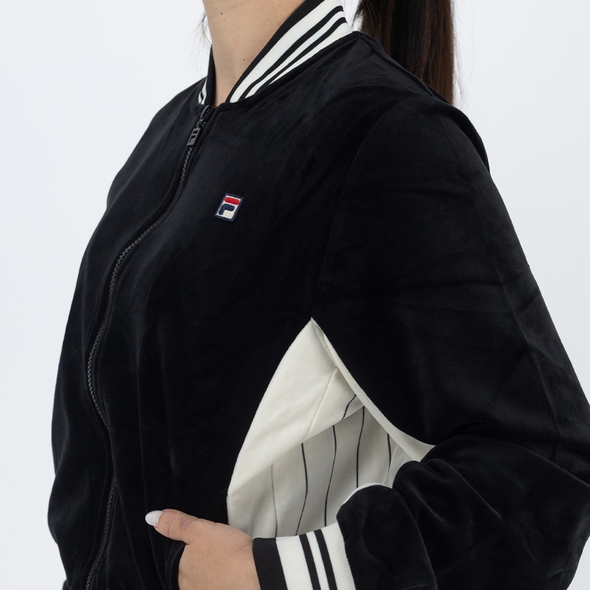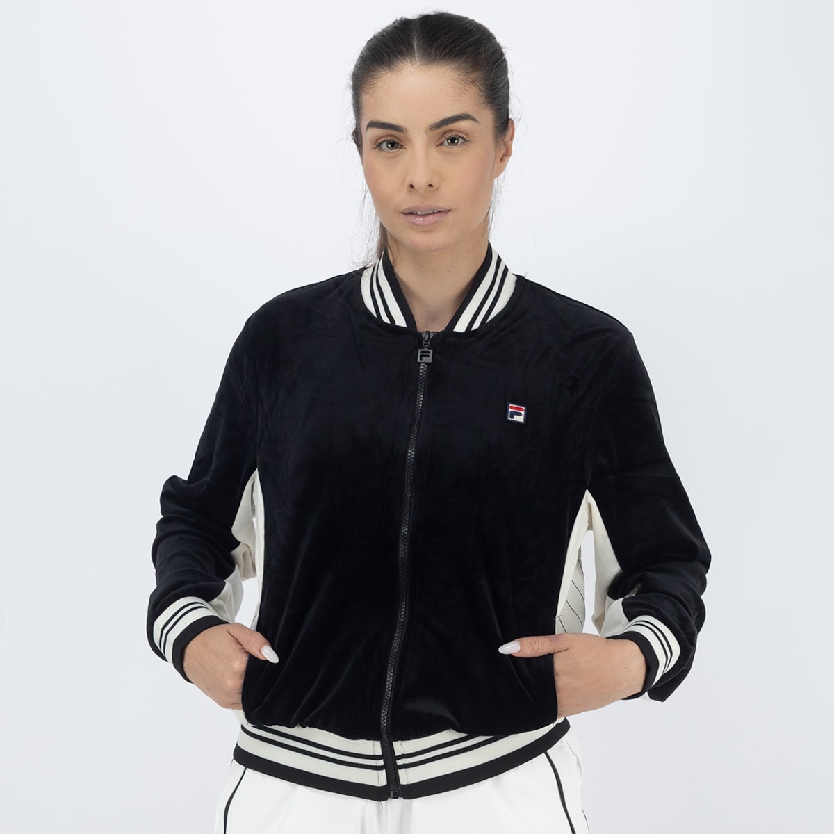 Fila é feita em veludo com toque macio e confortável, no corte regular estilo Settanta, inspirado na estética retrô dos anos 70. Possui zíper com puxador F-Box, gola, punhos e barra em ribana, além de recortes contrastantes nas mangas e laterais que dão personalidade ao visual. O patch