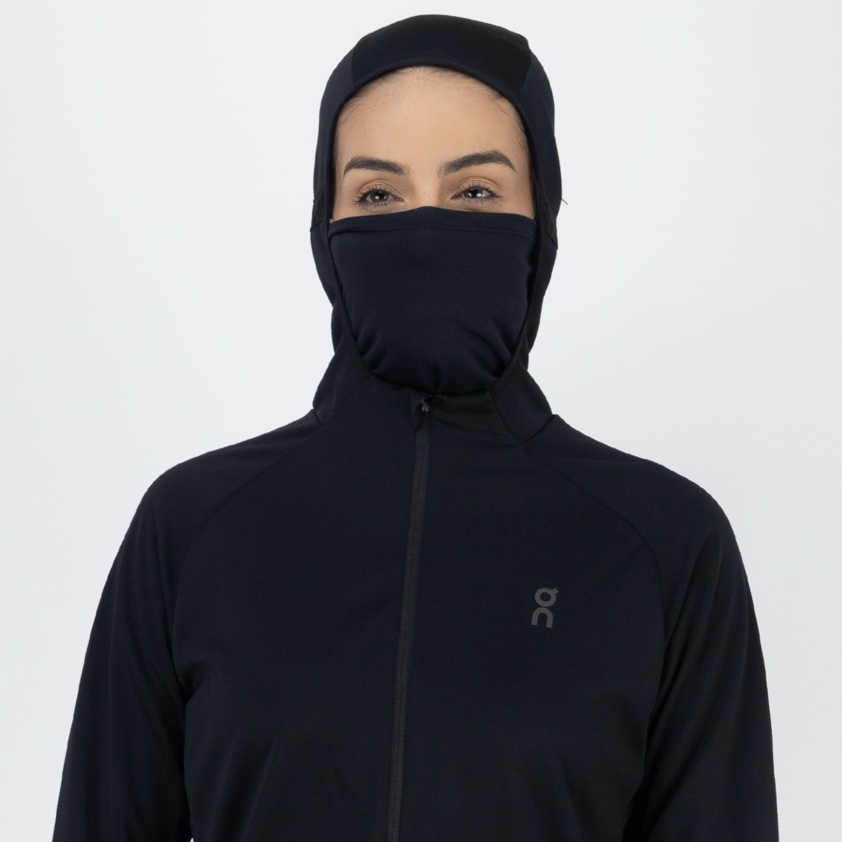 balaclava integrada, que protege o rosto e o pescoço. Os orifícios para polegar permitem que os braços fiquem totalmente cobertos, oferecendo calor adicional e evitando que as mangas subam durante o movimento. Prática e funcional, a