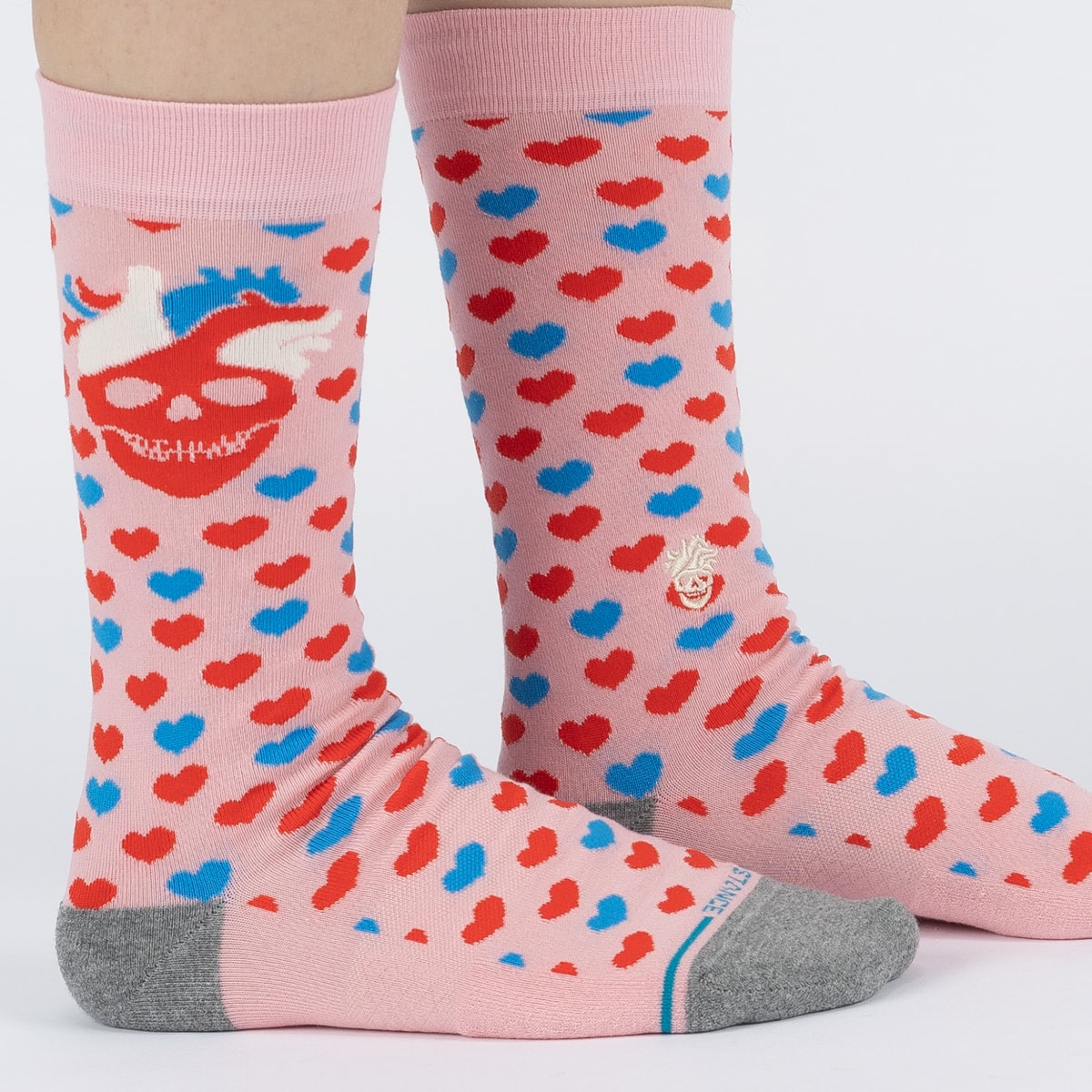 Sobre: Meia Stance em parceria com a StrangeLove - marca de skates de Sean Cliver -, feita em mix de fios macios, com biqueira e calcanhar reforçados para mais conforto e durabilidade. Ganha o icônico coração com caveira estampado, pequenos corações pela meia toda e os logos da Stance e StrangeLove bordados na parte interna dos canos.