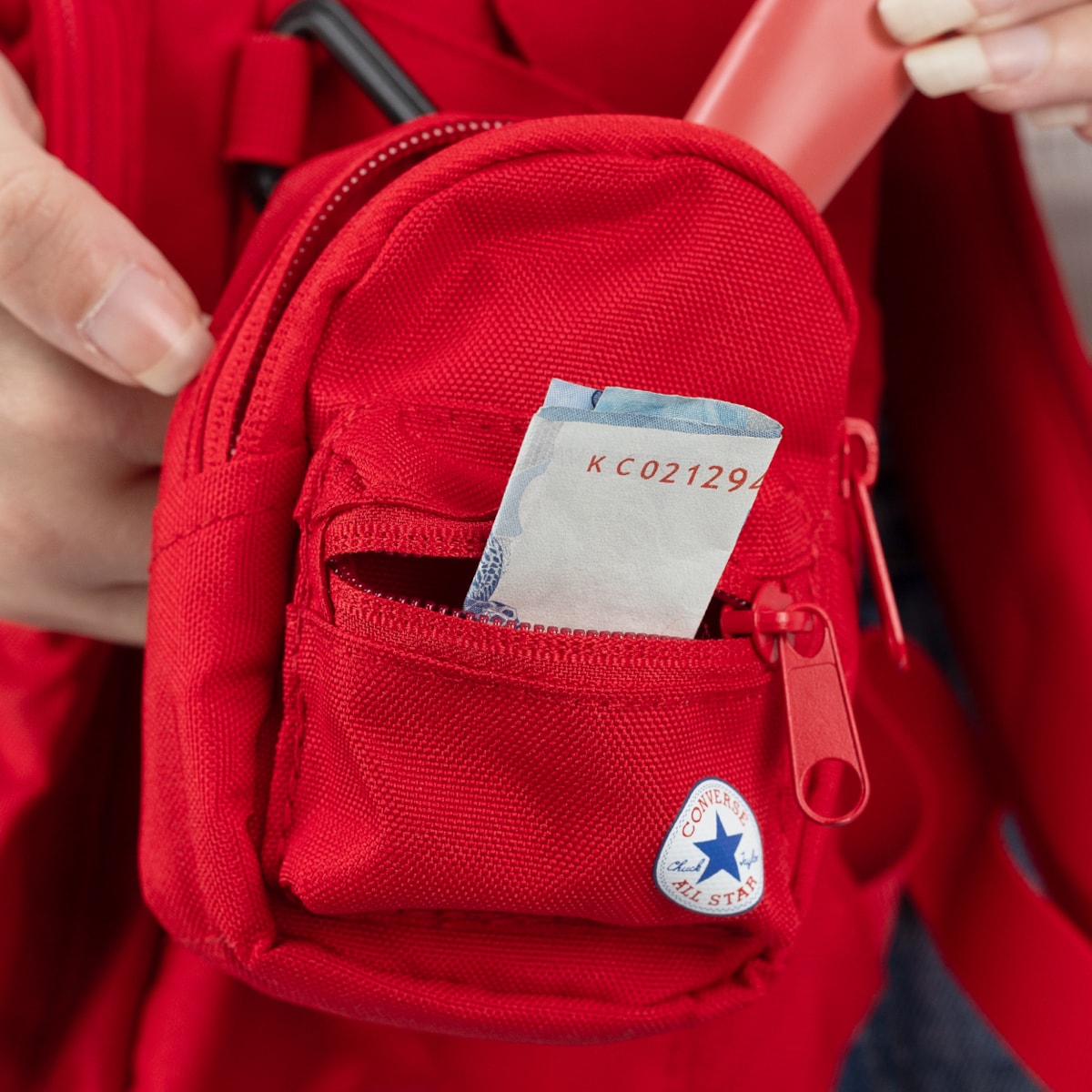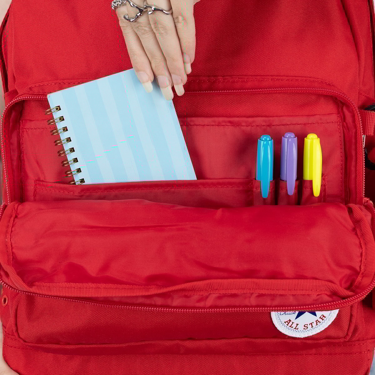 Converse Go 2 é confeccionada em poliéster e apresenta um design otimizado para fácil acesso e é feita para carregar tudo: garrafas de água nos bolsos laterais, notebook no bolso grande com compartimento interno e pequenos itens nos dois bolsos frontais organizadores. O logo