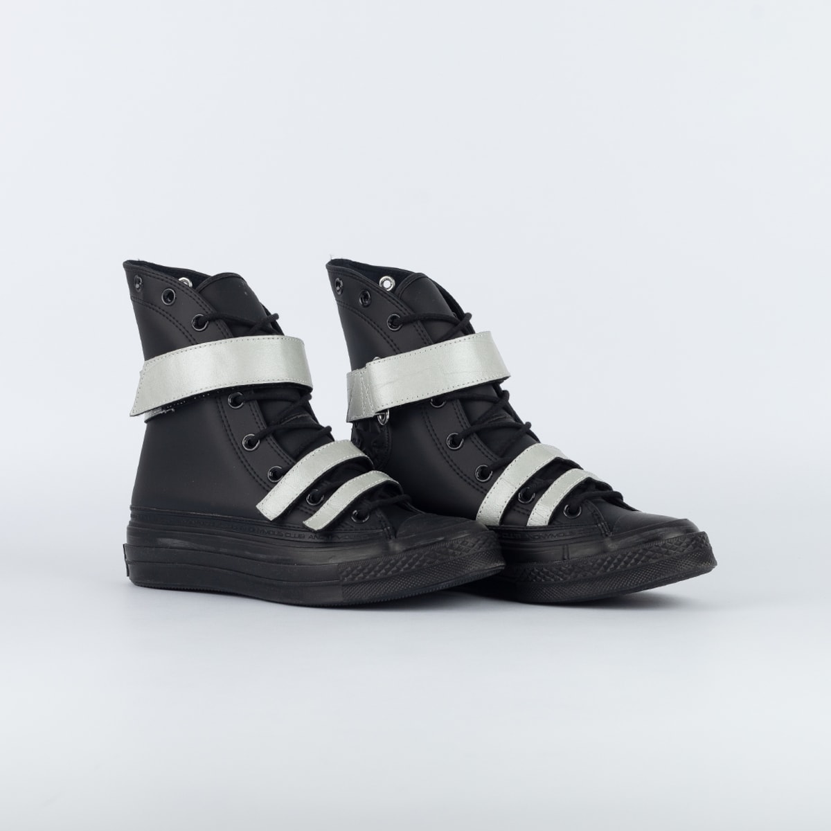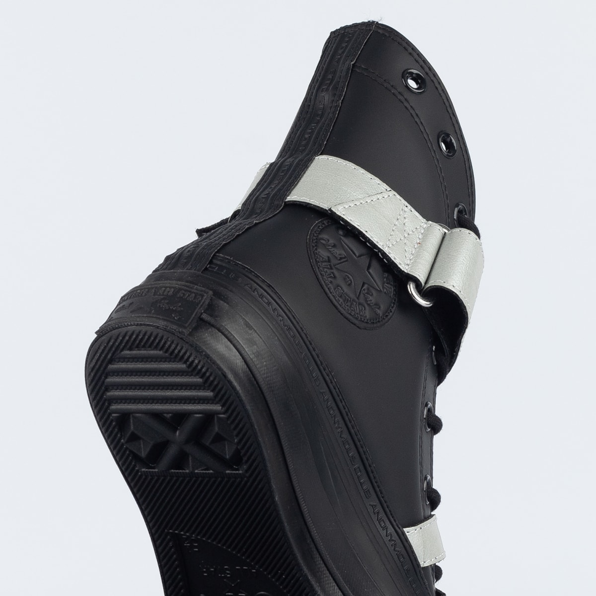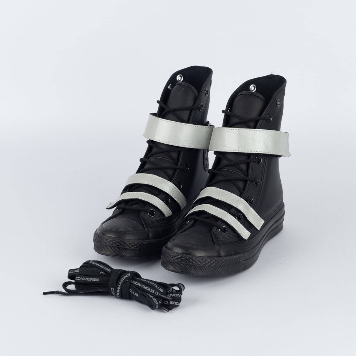 ANONYMOUS CLUB em faixa contínua que envolve todo o entorno, intensifica a estética da collab. O modelo ainda conta com um par de cadarço extra.