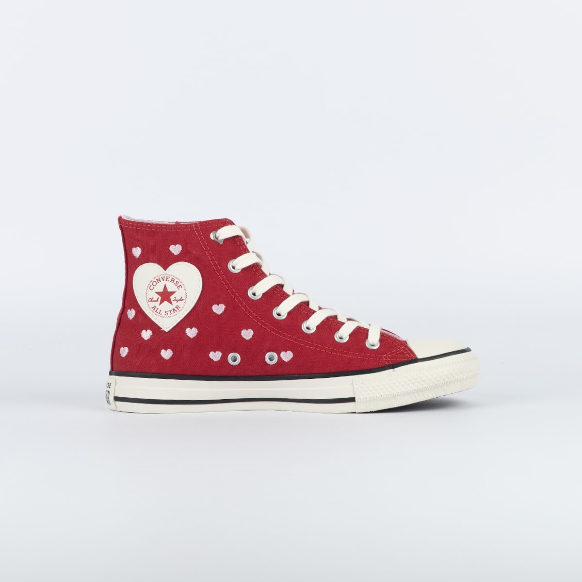 Tênis Converse Chuck Taylor All Star Hi Chucks In Love combina cores contrastantes e elementos visuais afetivos. O modelo conta com a durabilidade do cabedal, feito em