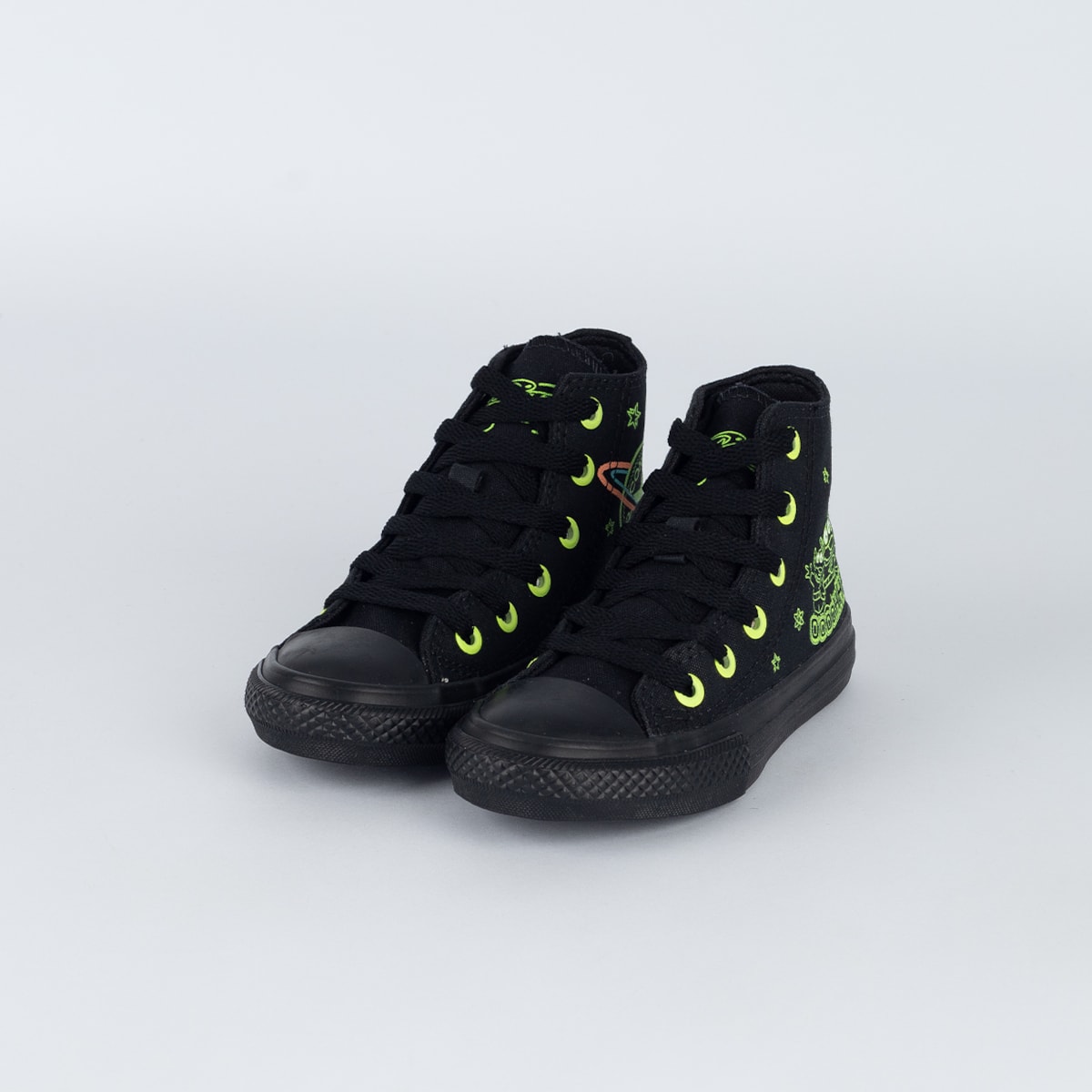 Chuck Taylor All Star, traz ícones e personagens que brilham no escuro, evocando a animação e o espírito aventureiro da