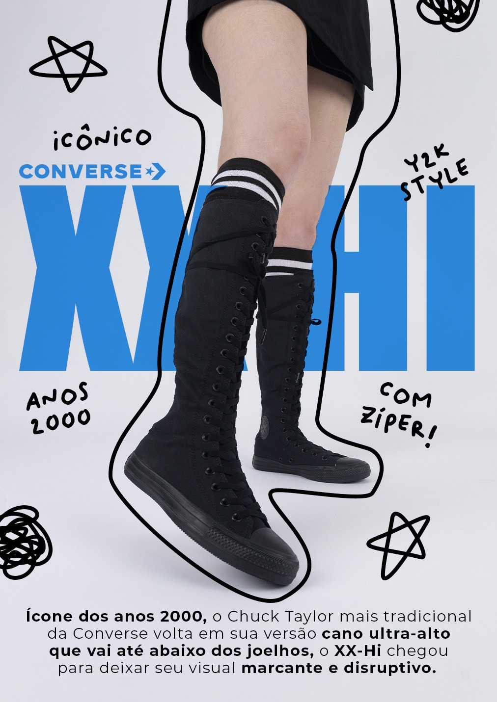Chuck Taylor All Star, volta em sua versão cano ultra-alto que vai até abaixo dos joelhos, trazendo um visual marcante e disruptivo. Confeccionado em tecido canvas de algodão tipo lona, nesta versão repaginada, o modelo possui a adição de um zíper traseiro para facilitar o calçar. O destaque vai para o seu cano, que possui aproximadamente 32,5 cm de altura, enquanto os dois ilhoses laterais permitem uma transpiração adequada aos pés. O logo