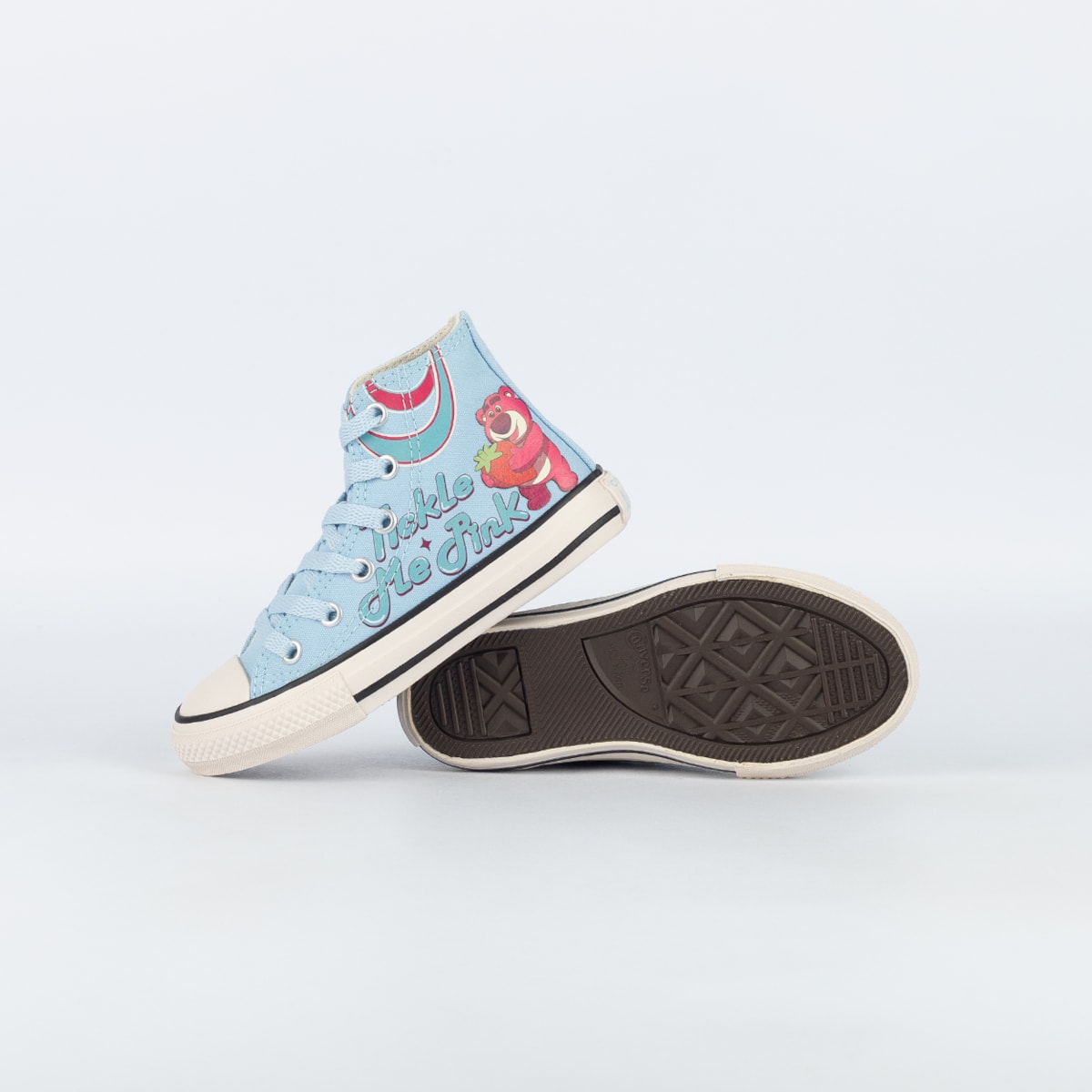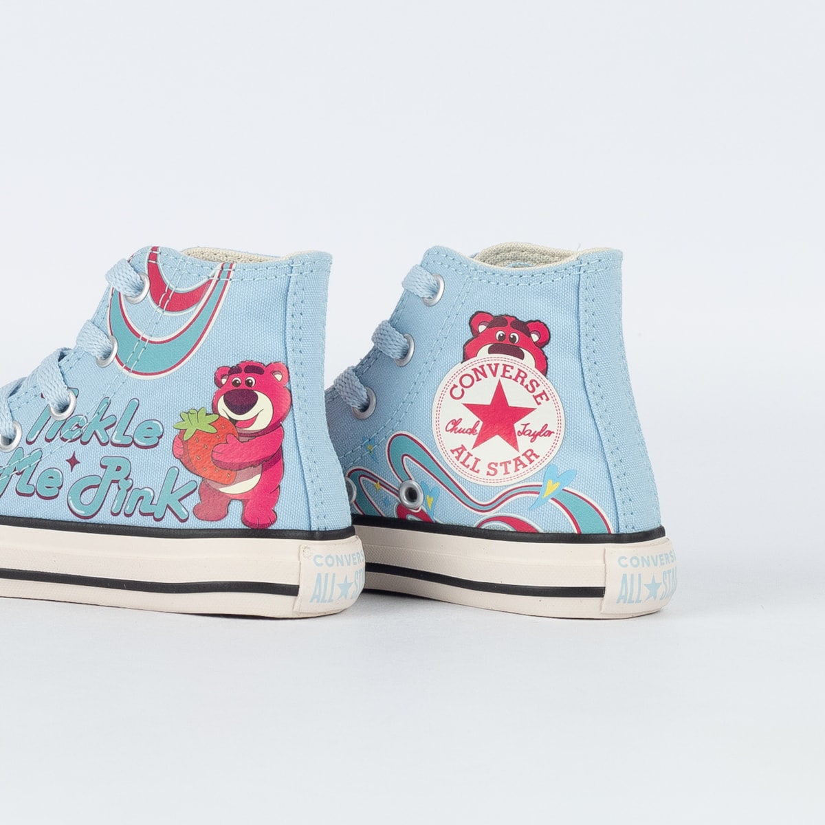 Sobre: O universo do filme Toy Story salta das telas direto para os pés com este Converse especial inspirado no urso Lotso. A silhueta clássica ganha vida com ilustrações de um dos personagens mais marcantes da saga. Cada elemento traduz a atmosfera divertida e acolhedora do filme, onde amizade, imaginação e aventura sempre caminham juntos. A tradicional tag traseira aparece aplicada no calcanhar e o solado de borracha vulcanizada garante mais aderência a cada passo.