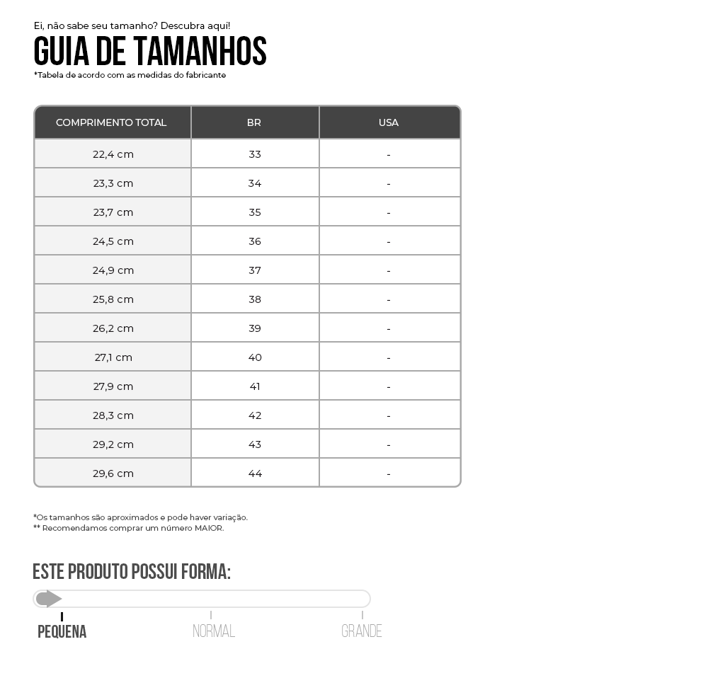 Forma: Pequena (Sugerimos comprar um número MAIOR)