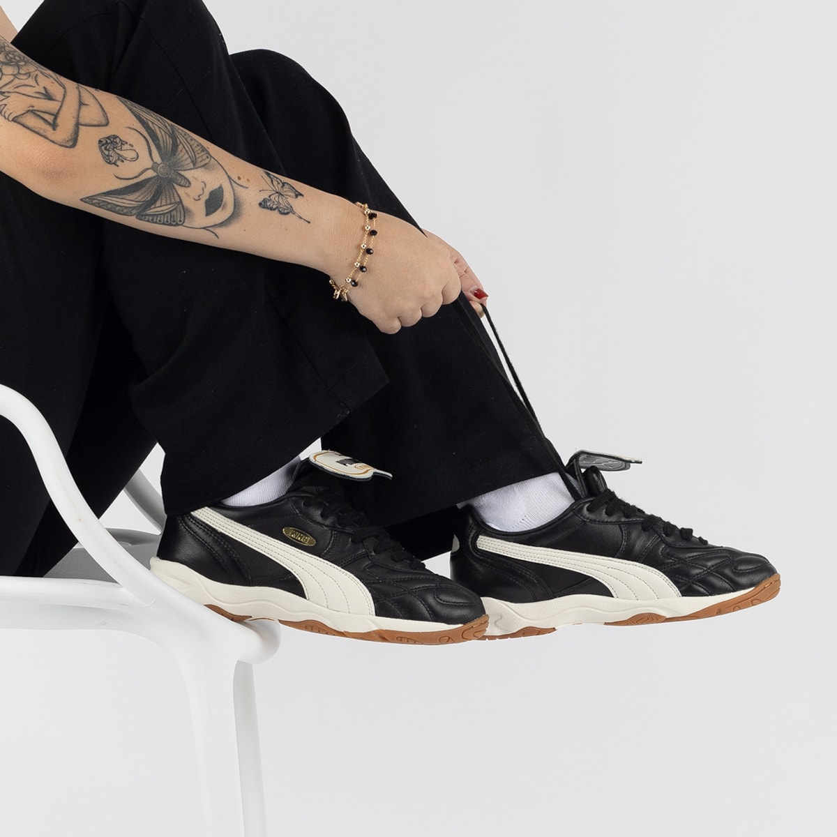 língua dobrável removível e os detalhes inspirados nas chuteiras de futsal reforçam o caráter esportivo com um toque de moda, enquanto o fechamento em cadarço garante ajuste seguro. A