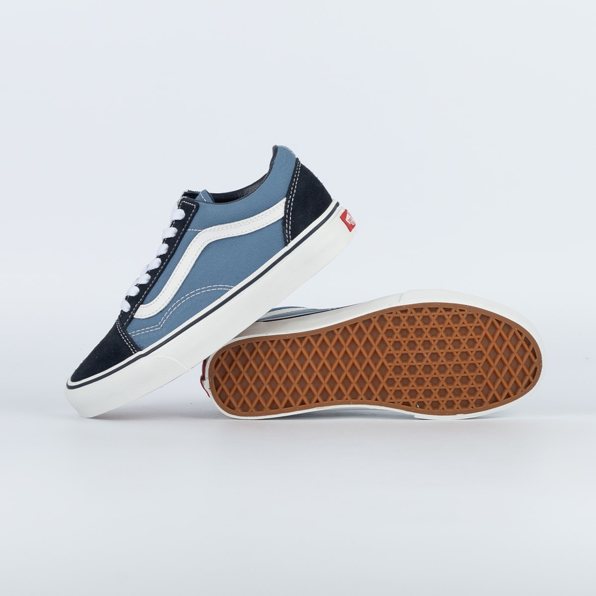 Old Skool, confeccionado em tecido de algodão canvas tipo lona, com sobreposições de couro na biqueira e calcanhar possui um design clássico e casual. As tradicionais