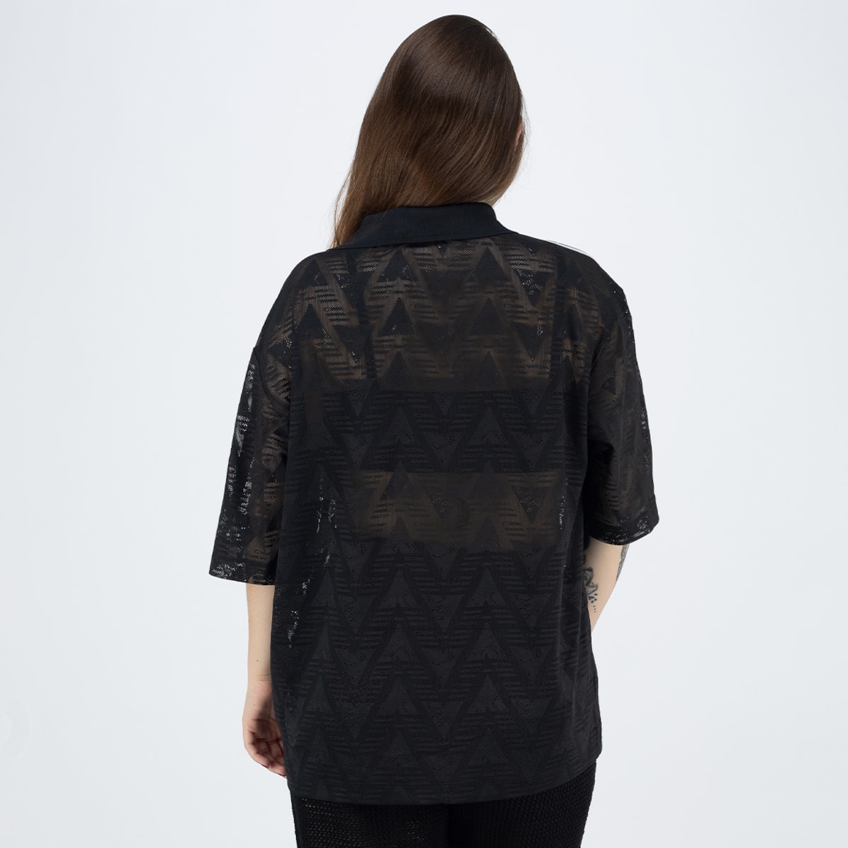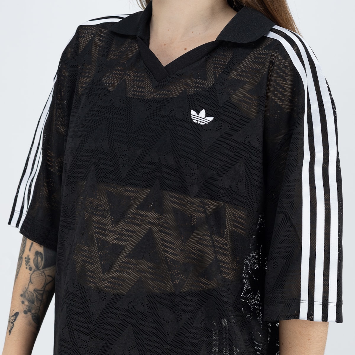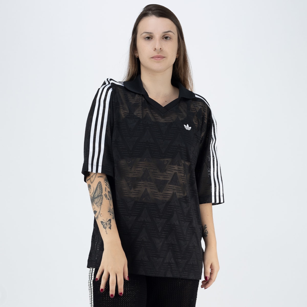 malha rendada com gola V e caimento leve criando um contraste marcante entre performance e estilo urbano, mantendo a identidade esportiva da